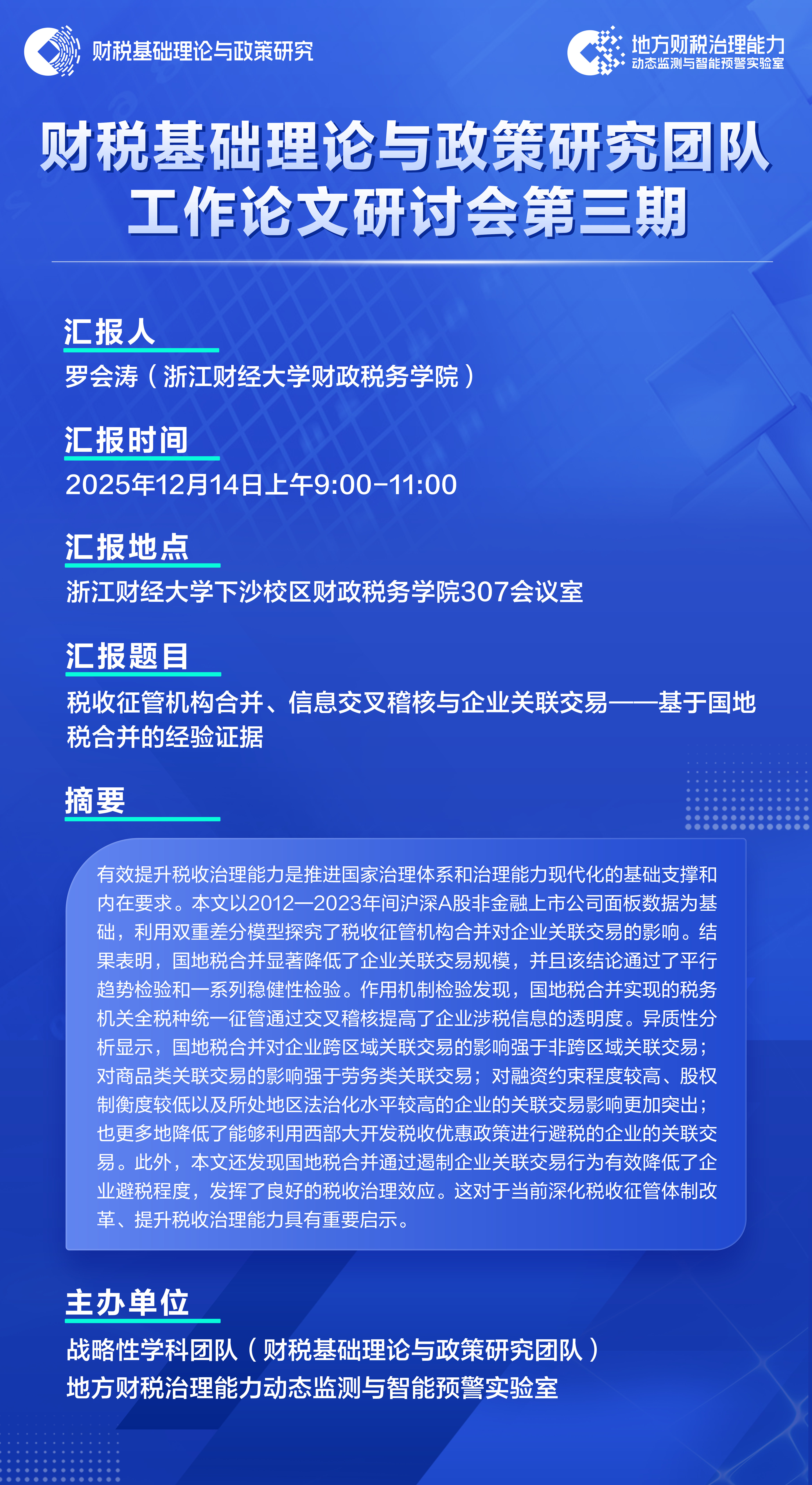【预告】财税基础理论与政策研究团队工作论文研讨会第三期