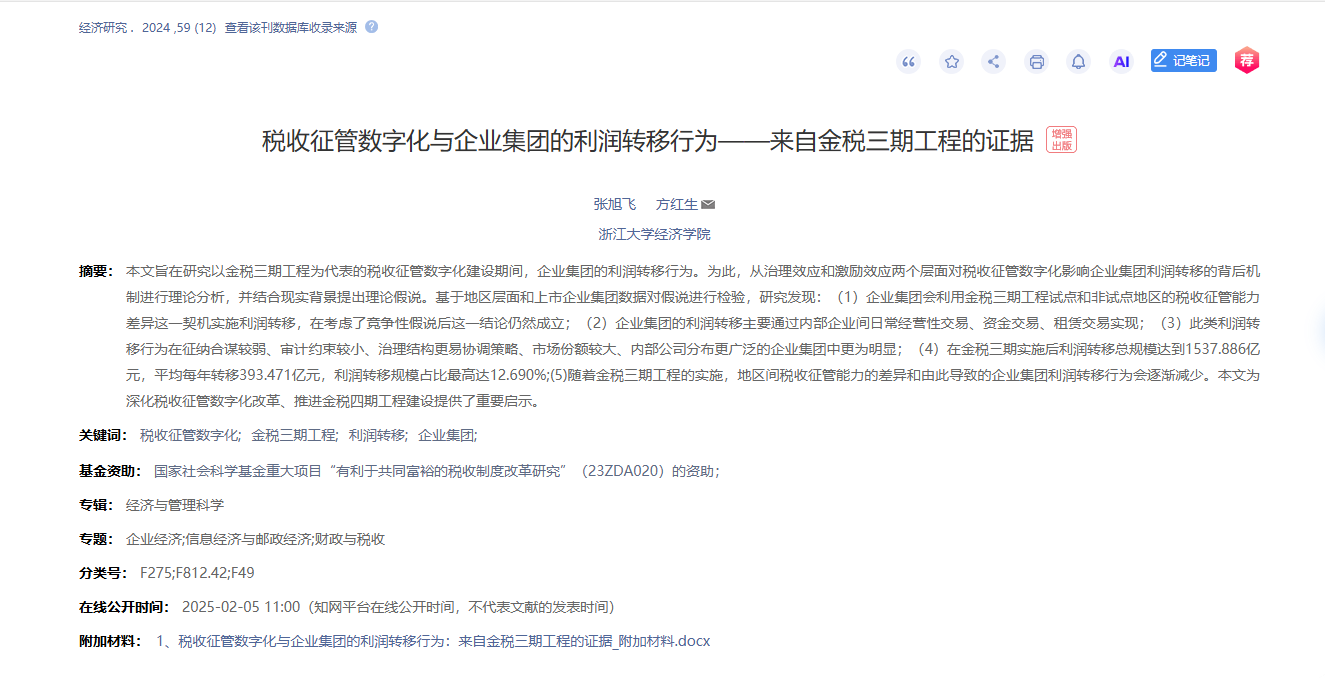 张旭飞博士发表于《经济研究》的论文《税收征管数字化与企业集团的利润转移行为——来自金税三期工程的证据》获基础理论研究优秀成果奖二等奖。