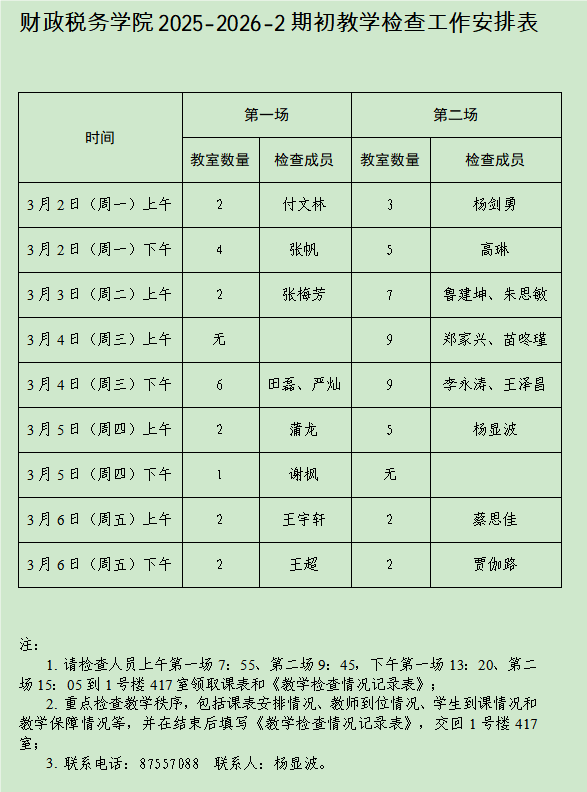 财政税务学院高度重视、精心组织,成立了由院长付文林、党委书记杨剑勇牵头,党委副书记张梅芳,副院长张帆、高琳,院督导组、各系主任、教学秘书、辅导员共同参与的教学检查工作小组。开学前专题部署了期初教学检查工作,传达学校通知精神,明确检查要求与分工,强调检查人员须提前到岗、认真履职,发现问题第一时间处理并上报。根据学院工作安排,检查期间每日分上午、下午四场次进行,每场次安排1-2名检查成员,分赴不同教室开展巡查,确保覆盖全部教学时段和课程门次。