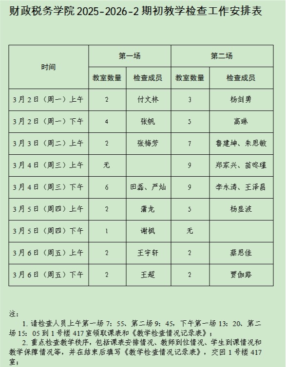 我院高度重视、精心组织,成立了由院长付文林、党委书记杨剑勇牵头,党委副书记张梅芳,副院长张帆、高琳,院督导组、各系主任、教学秘书、辅导员共同参与的教学检查工作小组。开学前专题部署了期初教学检查工作,传达学校通知精神,明确检查要求与分工,强调检查人员须提前到岗、认真履职,发现问题第一时间处理并上报。根据学院工作安排,检查期间每日分上午、下午四场次进行,每场次安排1-2名检查成员,分赴不同教室开展巡查,确保覆盖全部教学时段和课程门次。