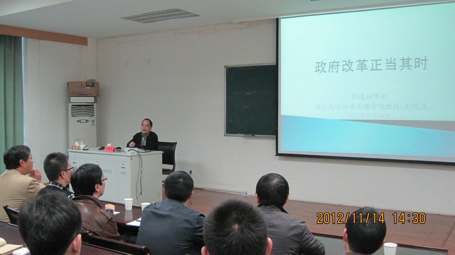 11月14日下午,应财政与公共管理学院的邀请,浙江大学公共管理学院副院长郁建兴教授为我院师生带来“政府改革正当其时”的专题讲座。讲座由财政与公共管理学院院长沈玉平教授主持,各系的老师以及我院近百名学生仔细聆听了此次讲座。整个教室座无虚席,讲座现场精彩纷呈、掌声雷动。