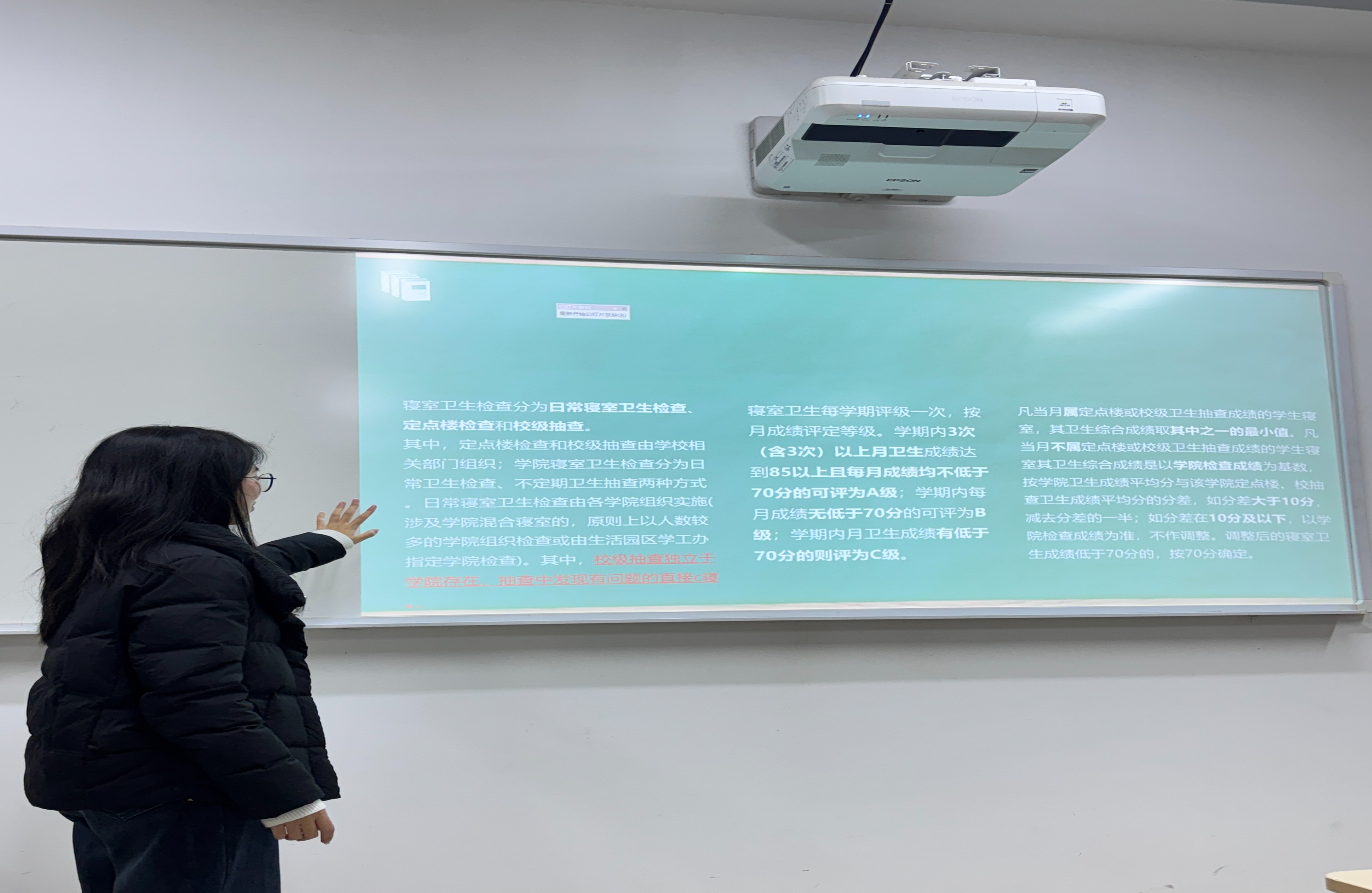 聚焦四级网格员能力提升,学院生活权益部针对各班安全委员、生活委员召开专题培训。培训围绕卫生评定、检查制度、“消C”调整机制等核心内容,拆解打分细则、明确职责边界,详解“消C五个办法”,树立“履职有激励、失职有后果”的导向。同时,明确四级网格员的信息传达职责,要求其及时、准确传达学院及生活权益部发布的各类通知,重点做好反诈宣传、晚归管理相关要求的传达落实,同步推送生活权益相关服务信息,确保通知直达每一个寝室、每一位学生。助力网格员找准“管理员、联络员、督导员”定位,既做好寝室管理工作,也当好信息传递的“桥梁”,提升寝室管理执行力,夯实工作基础。