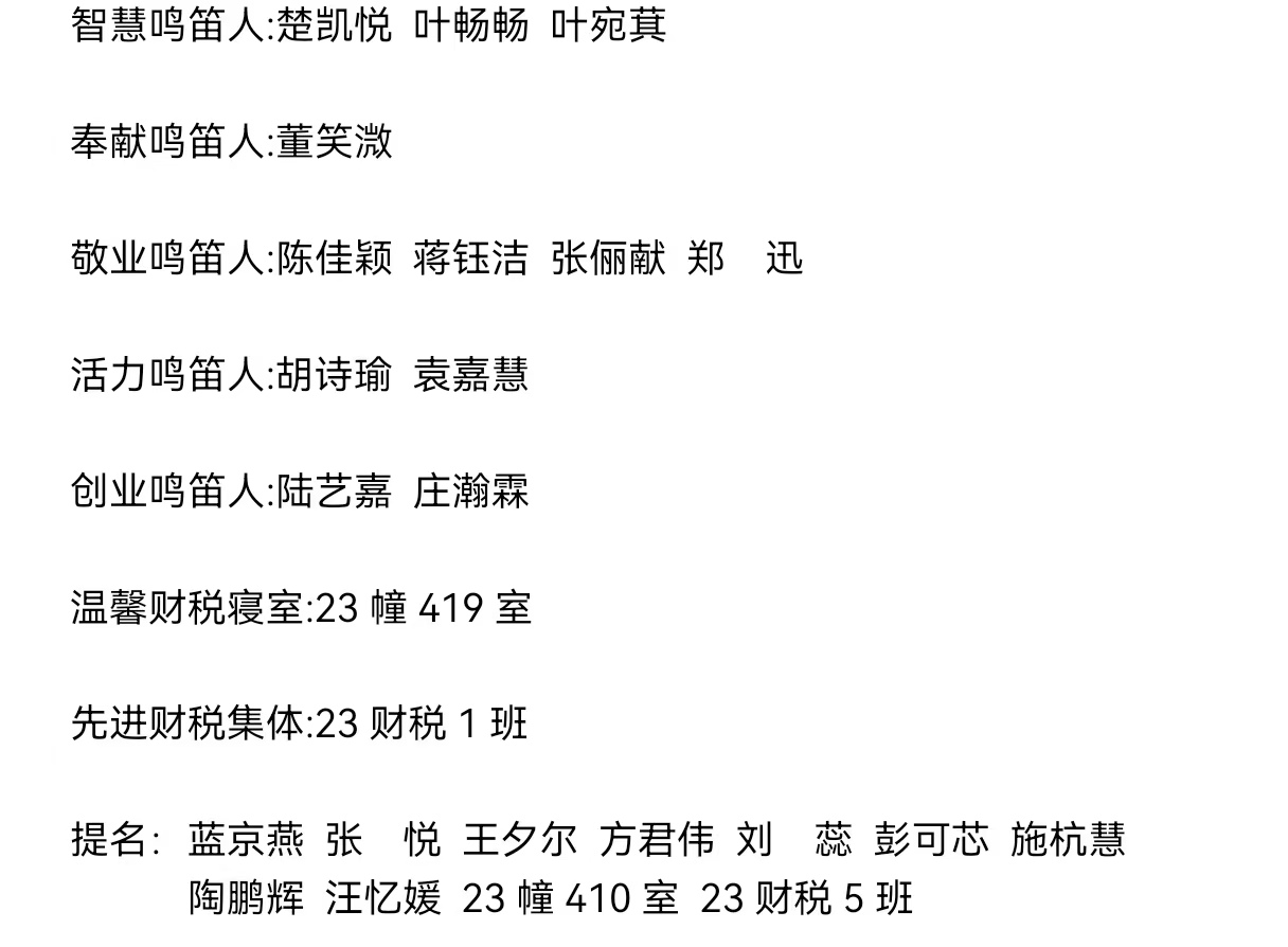 学生各班: 为充分发挥学生群体的青年榜样力量,进一步提升学院的良好学风,根据《财政税务学院第九届“财税鸣笛人”评选活动细则》,本次“财税鸣笛人”评选活动,经学生自主申请、学院初评,结合学生申请材料、答辩现场表现及平时表现,经学院评审会讨论,最终确定楚凯悦等14名同学(或集体)获得第九届“财税鸣笛人”荣誉称号,具体名单如下: 如有异议,请实名向学院学生工作办公室1-427反映 联系方式:0571-86732306 公示期:4月21日——4月23日 浙江财经大学财政税务学院 2026年4月21日